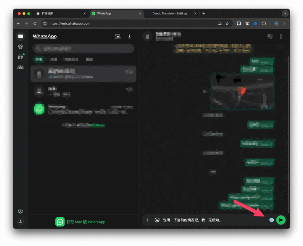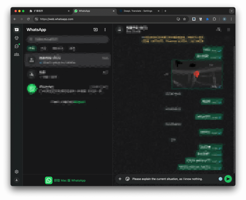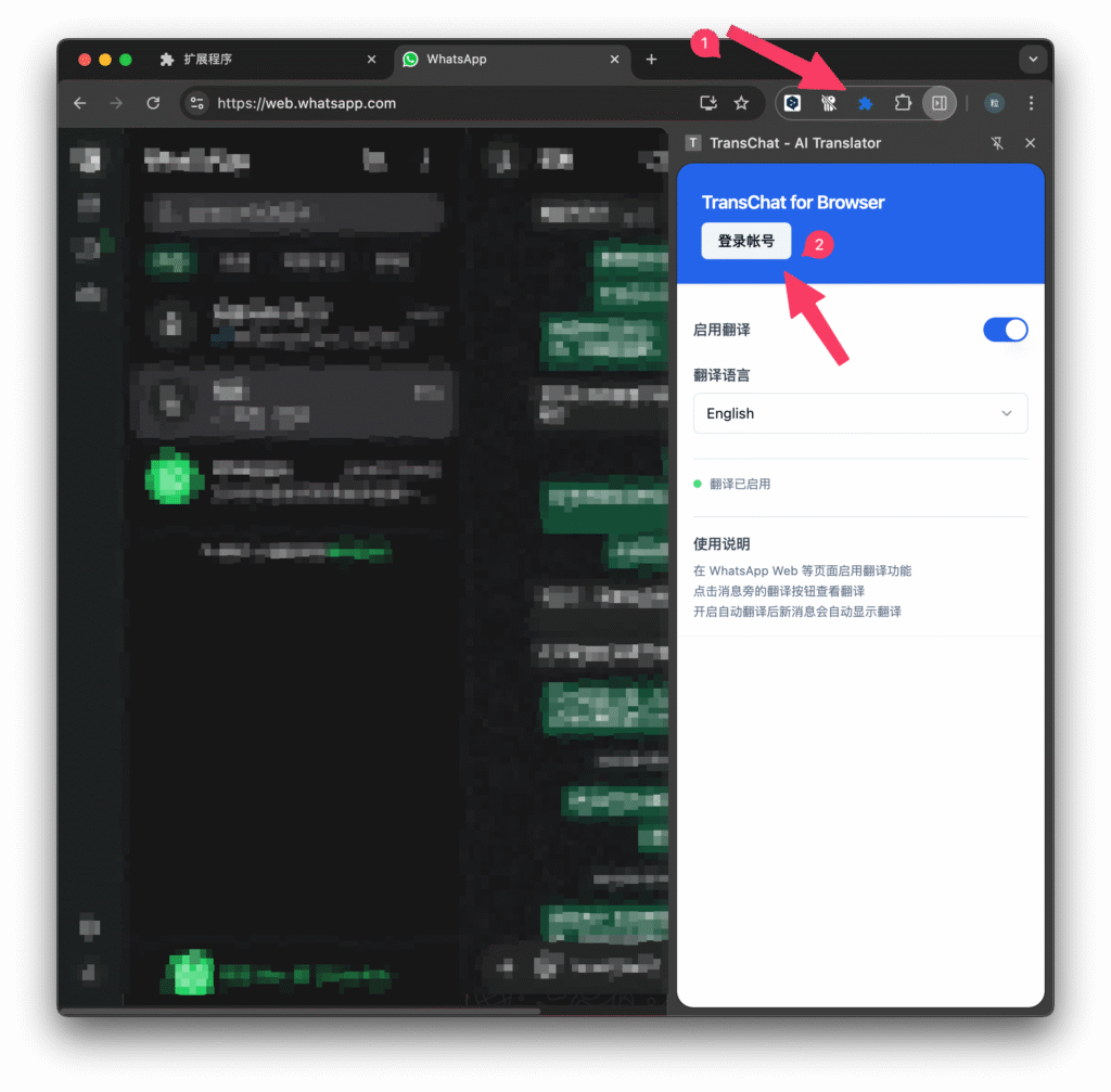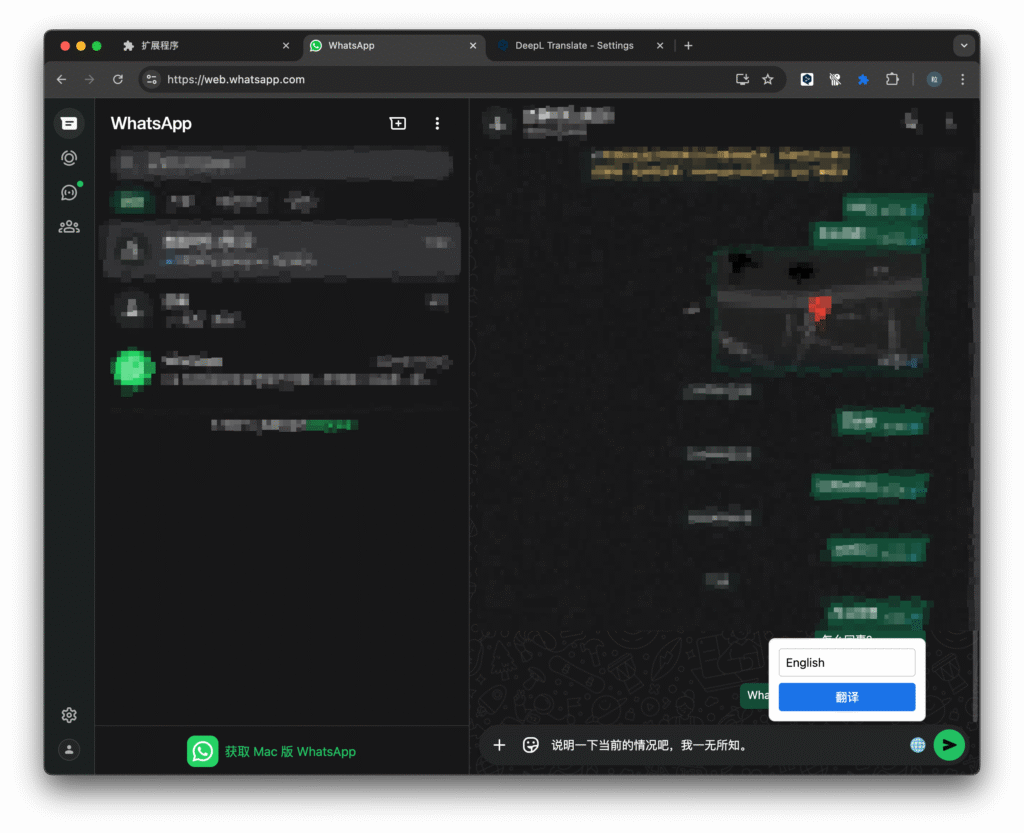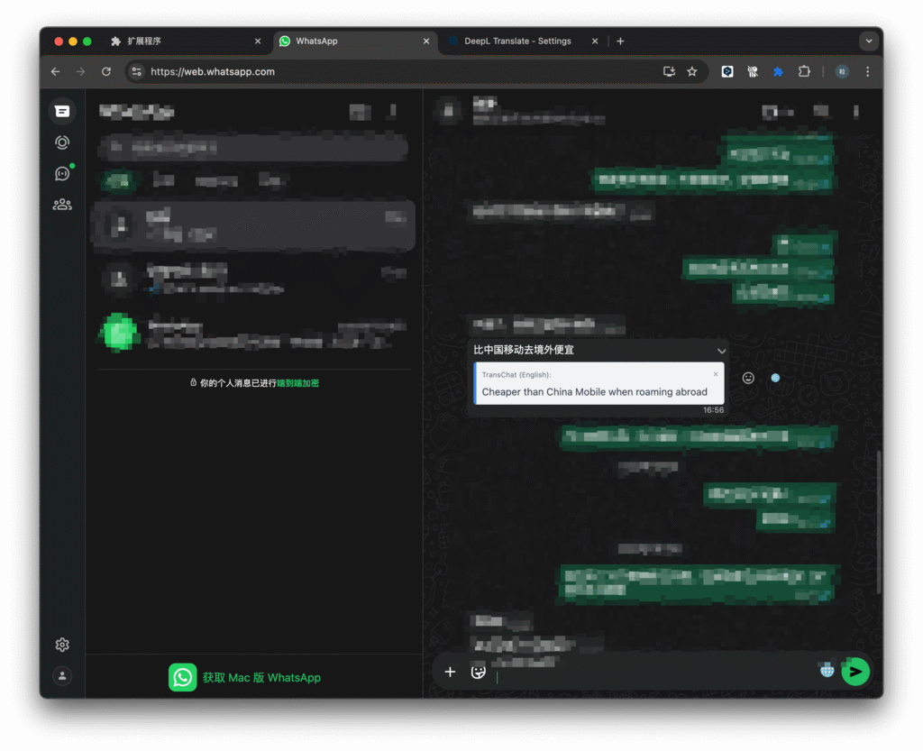 TransChat for Browser 是TransChat这个产品的浏览器插件版本,为WhatsApp、Telegram 等提供web端的翻译能力。