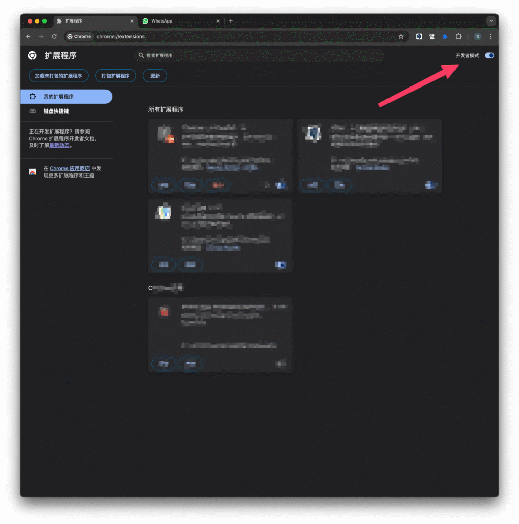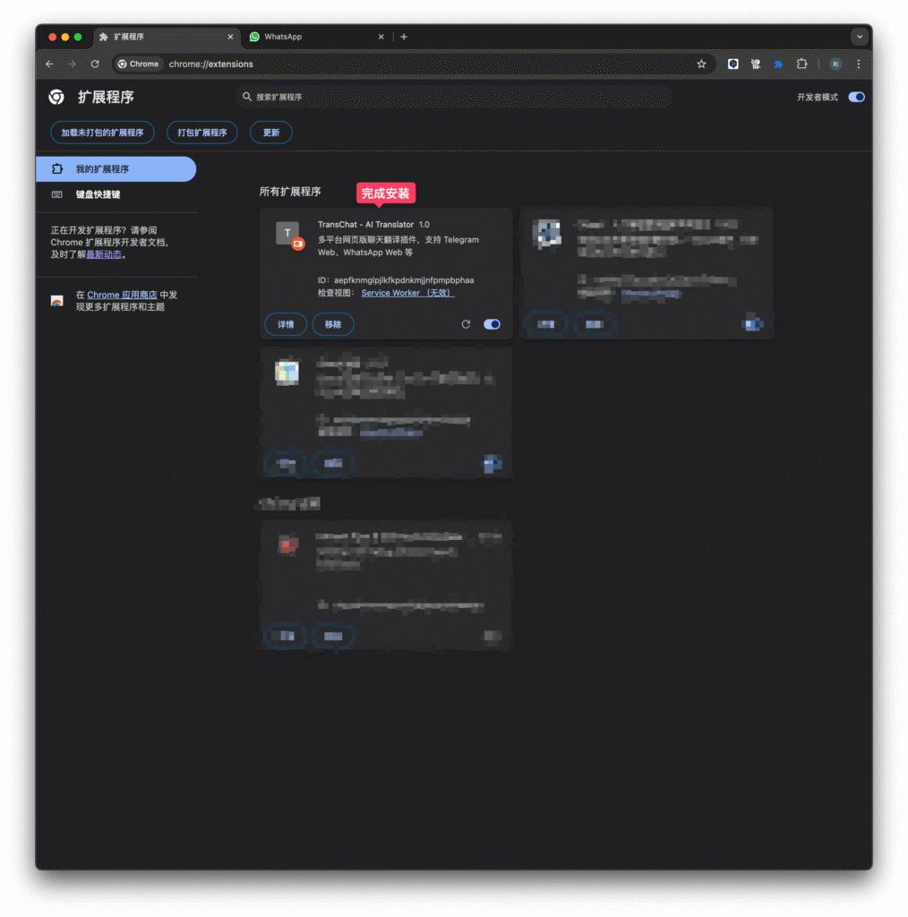 将 TransChat的浏览器安装包(通常是zip结尾的压缩包)直接将文件拖拽到「扩展程序」页面完成安装: