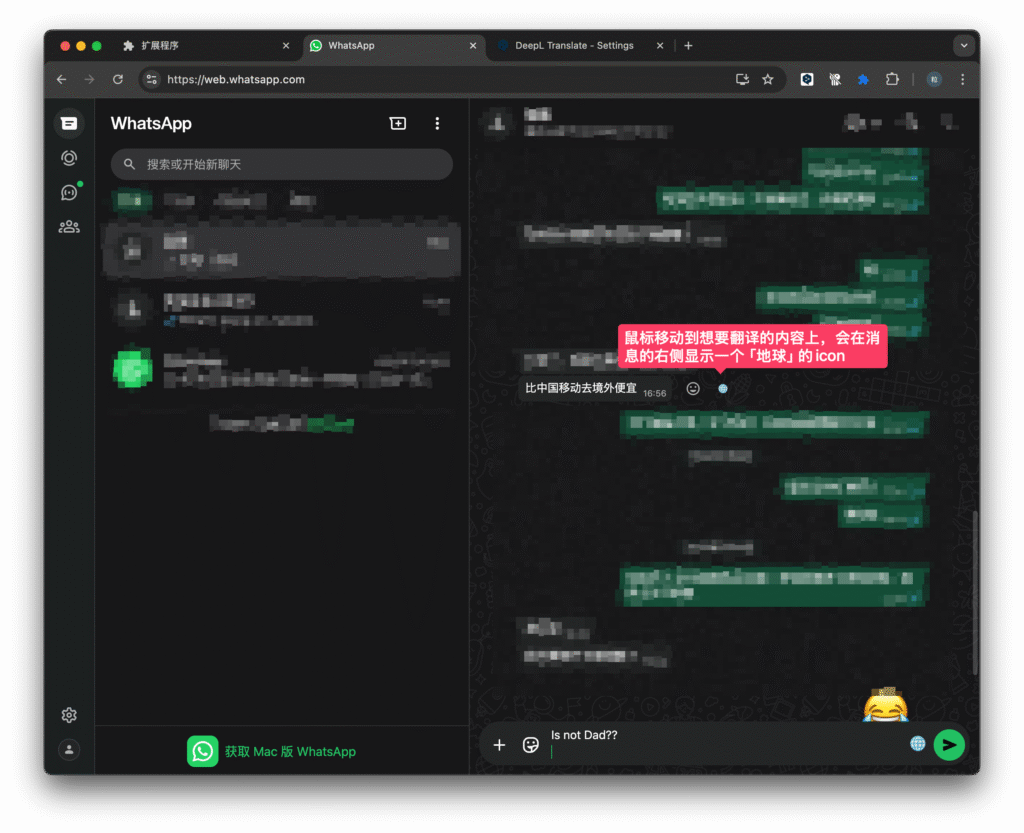 回到 WhatsApp,如果在沟通中我们需要翻译某个聊天,鼠标移动到内容上,右侧会出现一个「地球」的图标,点击即可翻译: