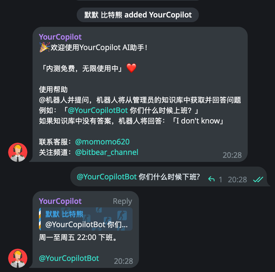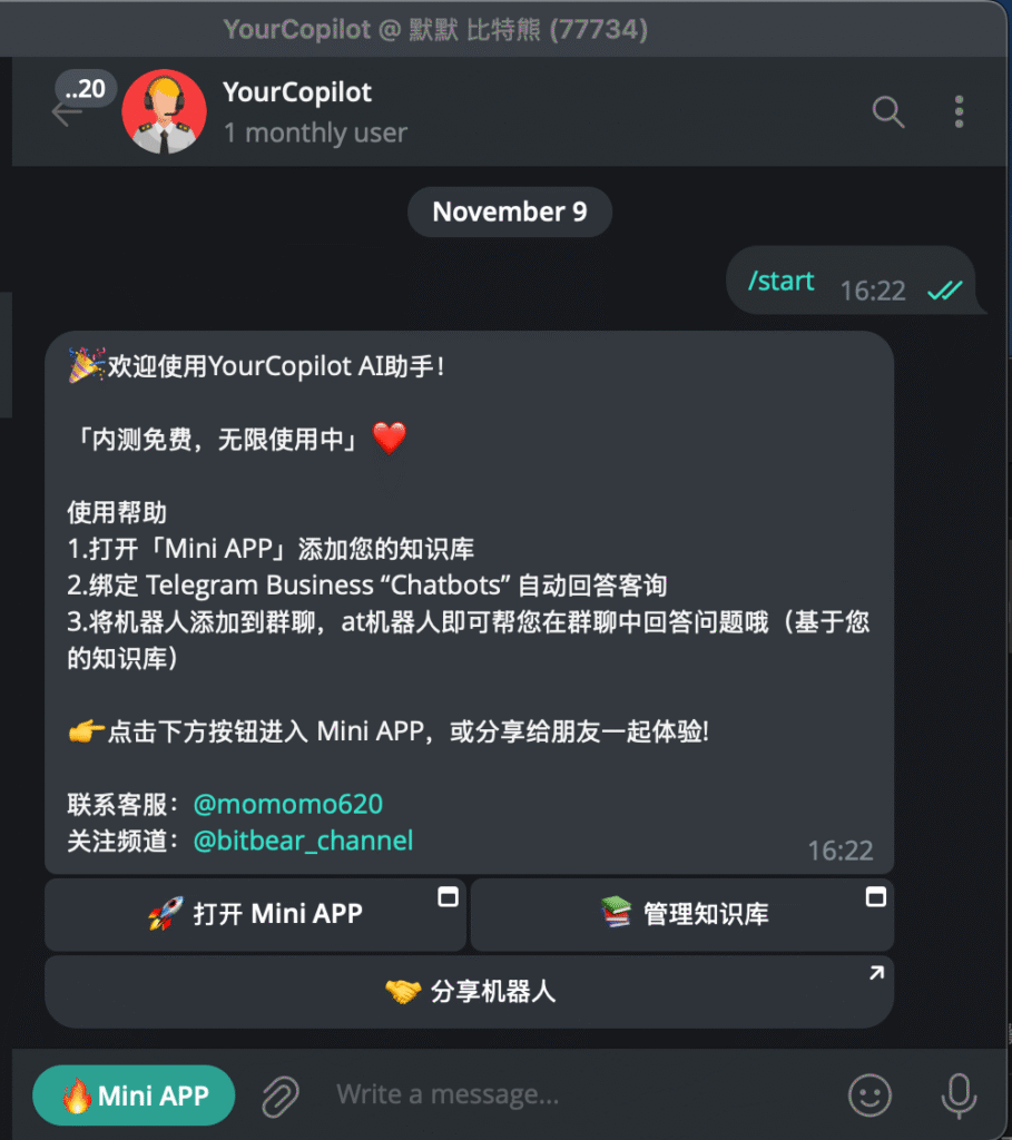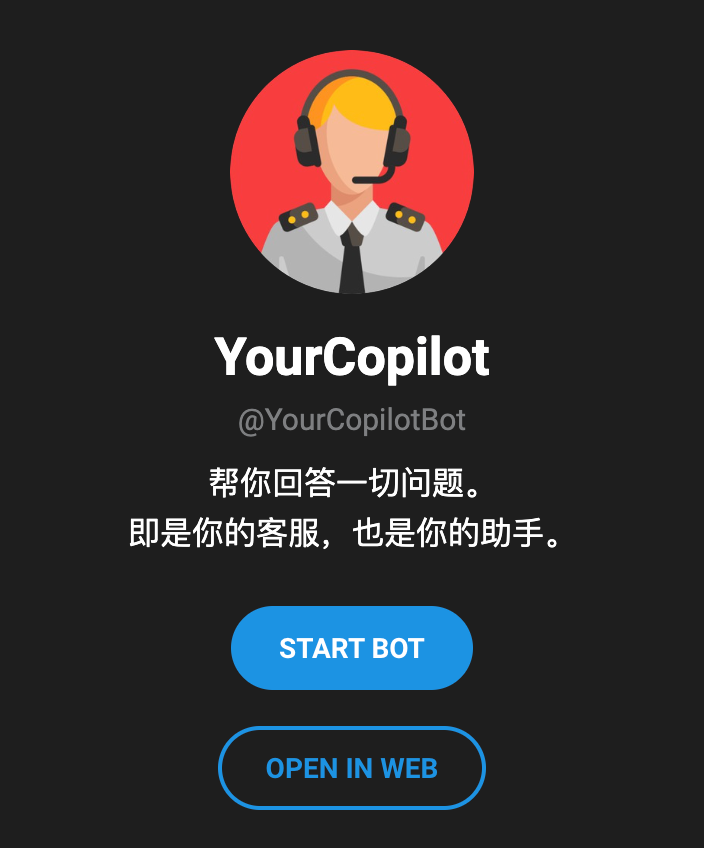 YourCopilot 是Telegram上的的一个AI客服机器人。