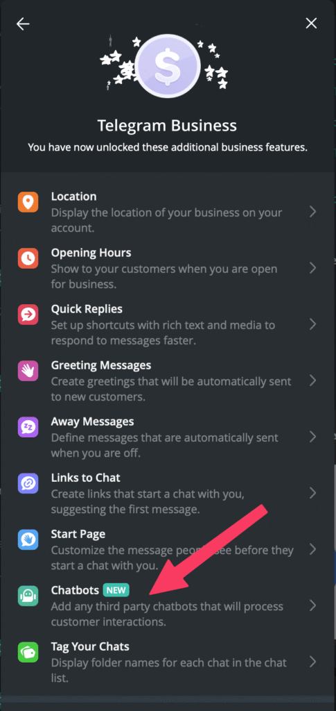 1v1私聊需要开通 Telegram 的Premium 会员,您可以通过 Business 功能,连接我们的机器人。
